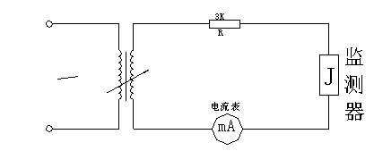 5、進行監(jiān)測器電流表測量特性試驗時,在工頻電壓可調(diào)回路中,依次串聯(lián)接入一個阻值為3K的電阻、監(jiān)測器、標準電流表(電流表的精度應(yīng)高于監(jiān)測器的測量精度)。校驗時從零逐漸增加電壓,從而驗證電流表的測量精度。(具體接線方法見圖1)
